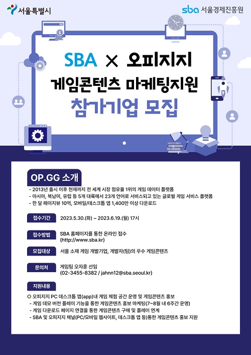 ...GG’ 게임 콘텐츠 마케팅지원 프로그램을 진행한다고 밝혔다. 이번 프로그램으로 OP. GG는 서울경제진흥원과 협력해 서울 소재 게임 기업이 자사의 게임을 유저들이 체험해볼 수 있는 플랫폼을 제공, 게임 산업 내 선순환 구조 확립 및 동반 성장을 위한 새로운 시도를 감행