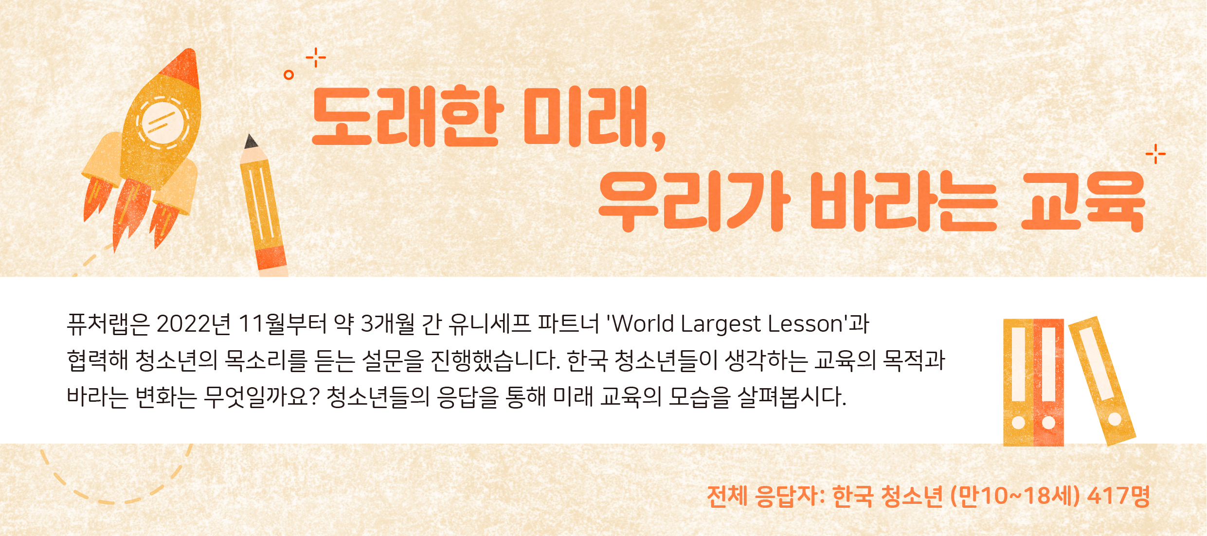 ... 지난 22년 11월부터 올해 1월까지 진행됐으며, 아시아, 유럽, 북미 등 150개국 3만 7천여 명의 어린이, 청소년들이 참여했다. 국내에서는 퓨처랩을 통해 417명이 동참했다. 캠페인 설문 결과는 오는 9월 UN에 제출될 예정이다
