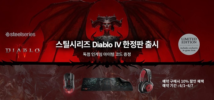 ... 더불어 마우스, 마우스와 패드 예약 구매자 대상으로 한정 추첨을 진행해 7월 초 정발 예정인 한정판 헤드셋 아크티스 노바 7 디아블로 4 에디션 (1명)과 국내에서 만나볼 수 없는 디아블로 4 아티산 키캡 (5명)을 경품으로 증정한다. 스틸시리즈 디아블로 4 한정판은 스틸