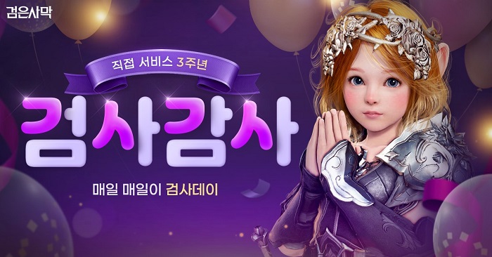 ... 검은사막을 즐기며 경품까지 얻을 수 있는 '검사데이' 이벤트를 5월 23일부터 30일까지 진행 중이다. 매주 금요일 진행하던 '금요일은 검사데이' 이벤트를 3주년을 맞아 '매일 매일 검사데이'로 확장했다. 이용자는 게임에 접속해