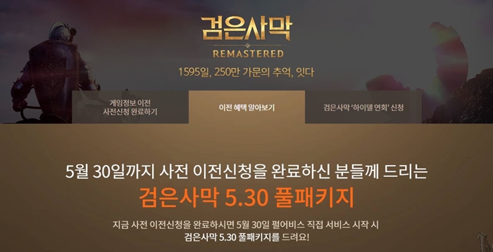 ...이용자들은 게임 데이터 이관 신청 페이지에서 이관 신청 절차를 통해 자신의 기존 캐릭터 그대로 ‘검은사막’을 즐길 수 있다 . 이관 신청은 29일부터 12월 31일까지 진행된다. 이용자들은 사전 이관 신청 기간인 5월 30일까지 신청 시 특별한 혜택을 받을 수 있다