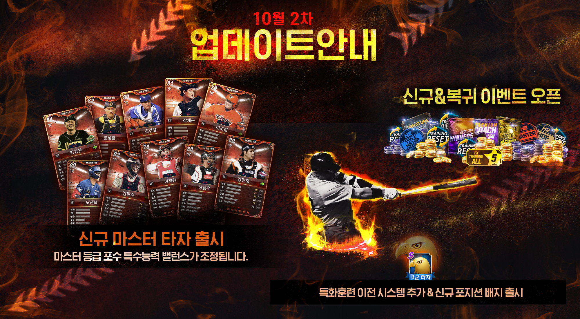 ... 마스터 포수를 이미 보유한 NC에는 유격수 포지션의 타자가 추가된다. 마스터 포수는 힘과 수비가 20씩 증가하고 주자 유무에 따라 안타, 장타, 홈런 확률이 상승한다. 마스터 타자의 라인업 제한이 증가해 이용자는 3명의 마스터 타자를 라인업에 등록할 수 있다