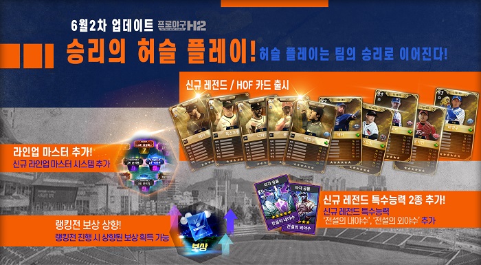 ... 선수 능력치와 특수 능력에 버프(buff, 강화 효과)를 받을 수 있다. 이용자는 9등급까지 성장시킬 수 있는 ‘라인업 마스터’를 활용해 팀 전력을 높일 수 있다. 엔씨(NC)는 신규 레전드 특수능력 2종을 추가했다