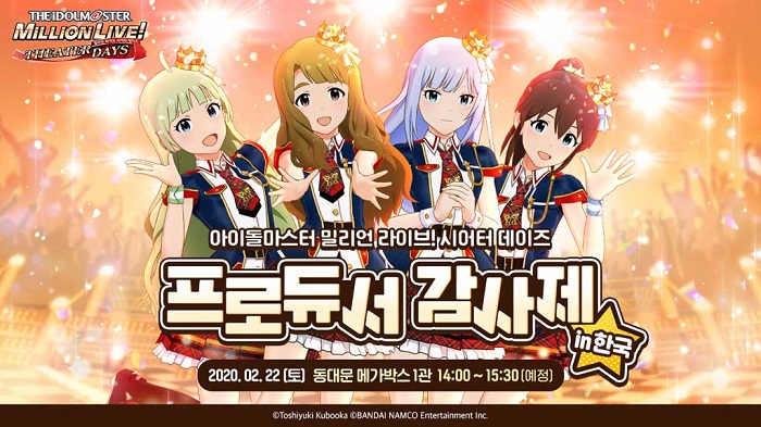 ... 이번 오프라인 이벤트에는 프로듀서 초청 토크쇼 외에도 다양한 즐길 거리 행사가 진행된다. 먼저 프로듀서 초청 토크에서는 아이돌마스터 총괄 프로듀서인 사카가미 유죠 PD와 코미노 히데후미 밀리시타 PD가 참석하여 ‘아이돌마스터 밀리언 라이브! 시어터 데이즈’의 최신 정보를