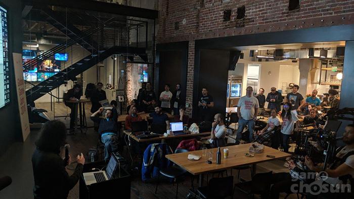 ...유니티 세미나 전경 = 게임조선 촬영유니티코리아는 22일 유니티 엔진을 활용한 애니메이션 개발 기술 및 실제 사례를 공유하는 세미나 ‘유니티로 만나는 애니메이션의 세계!’를 서울종합예술실용학교 아트홀에서 개최했다. 유니티의 에반젤리스트가 강연대에 올라 실시간 렌더링을 통해 생산성을