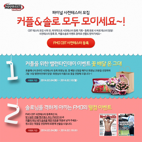 ... 이번 테스터 모집은 비공개 테스트(CBT) 시작 전 마지막 참여 기회다. 세가퍼블리싱코리아은 이번 테스터 모집을 기념해 특별 이벤트를 진행한다. 먼저 2월 4일부터 10일까지 '풋볼매니저 온라인'의 사전테스터로 등록한 회원 중 추첨을 통해 밸런타인데이 당일 꽃다발을 전달한