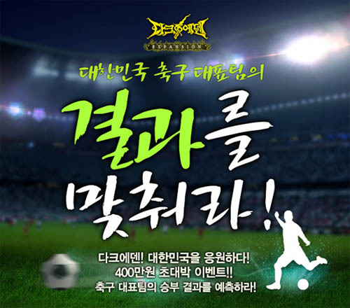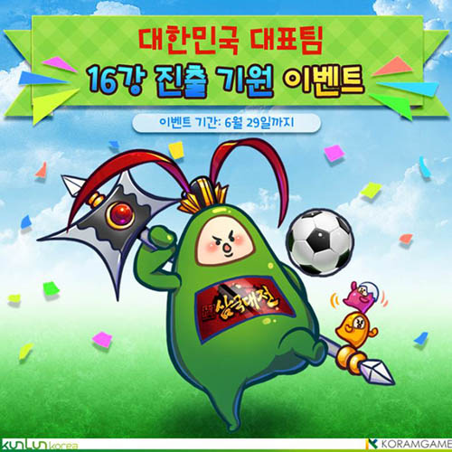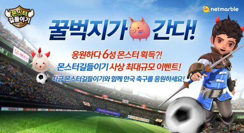 ... 또 대한민국 경기 당일 게임에 접속하면 6성 몬스터 및 장비, 수정, 열쇠 등 다양한 아이템을 획득할 수 있는 꿀벅지의 응원상자를 전원 지급하며 경기에서 승리할 경우 몬스터 뽑기권을 추가 제공한다. 6월 13일부터 7월 14일까지 축제 기간 내내 승부예측 이벤트도 진행한다