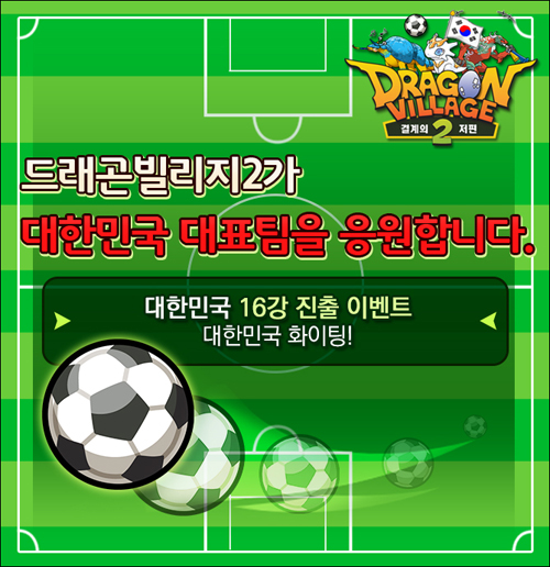 ... 또한 대한민국 축구 대표팀의 조별 예선 경기가 열리는 6월 18일(수요일), 23일(월요일), 27일(금요일)에 맞추어 드래곤빌리지2 게임에 접속하면 선물을 받을 수 있으며 예상되는 스코어를 맞추는 퀴즈 및 승리 기원 댓글 이벤트에 참여하면 추첨을 통해 다이아를 얻을 수 있다.