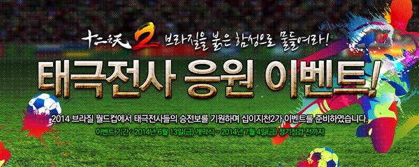 ... 이와 더불어 이벤트 기간 동안 2014 축구복 의복을 50% 할인 판매한다. SG데이타 이재용 게임사업본부장은 “태극전사들의 승전보를 기원하며 전세계인이 열광하는 축구 축제의 감동과 보는 즐거움이 배가 되기 바라는 마음으로 이벤트를 기획하게 됐다”며 “십이지천2와 함께 축구