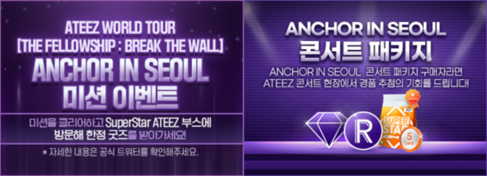 ... 달콤소프트는 콘서트 현장에서 플레이 부스를 설치하여 ATEEZ의 곡들을 직접 플레이할 수 있는 경험을 선사할 계획이다. 선착순으로 배부되는 참가 팔찌를 소지한 사람은 플레이 이벤트에 참여할 수 있으며, 곡 플레이를 완료하면 ATEEZ의 초상이 담긴 종이 포토카드와 인게임