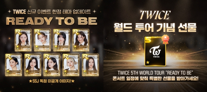... 뿐만 아니라 SuperStar JYPNATION 홍보 부스 현장에서 TWICE 콘서트 이벤트 미션 클리어를 인증하거나, 콘서트 기념 패키지 상품을 구매한 유저들에게는 TWICE의 초상이 담긴 실물 포토카드 경품을 제공할 예정이다. 특히, 경품 중에는 SuperStar JY