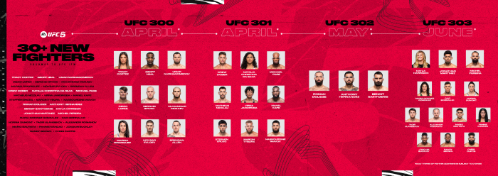 ... 6월 말까지 30명 이상의 선수가 추가되어 현재 UFC 상위 10위 선수 랭킹과 98%까지 동등성을 보장할 예정이며, 이는 EA SPORTS UFC 역사상 가장 큰 규모의 포스트 런칭 로스터 확장으로, 각 업데이트를 통해 추가되는 모든 선수는 무료로 이용할 수 있다. 모든 선수