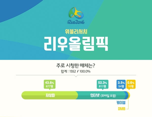 ... 이번 설문조사는 ‘리우올림픽’을 주제로 지난 8월 24일부터 31일까지 일주일간 옐로스토리의 블로그 마케팅 플랫폼 ‘위드블로그’ 회원들을 대상으로 진행됐다. 설문조사 결과 전체 응답자의 66. 4%(1,216명)는 대한민국 대표팀이 출전한 경기를 10회 이하 시청한 것으로