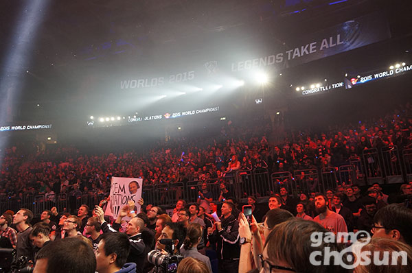 ... 열광적인 응원, 벤츠 아레나를 '쿠'를 연호하는 응원이 가득 메웠다. 31일 독일 베를린 벤츠 아레나에서 열린 '2015 리그오브레전드(LOL) 월드챔피언십(이하 롤드컵)' 3세트 경기에서 KOO 타이거즈가 SK텔레콤 T1을 상대로 2패 뒤 1승을 올리며 반격의 신호탄을