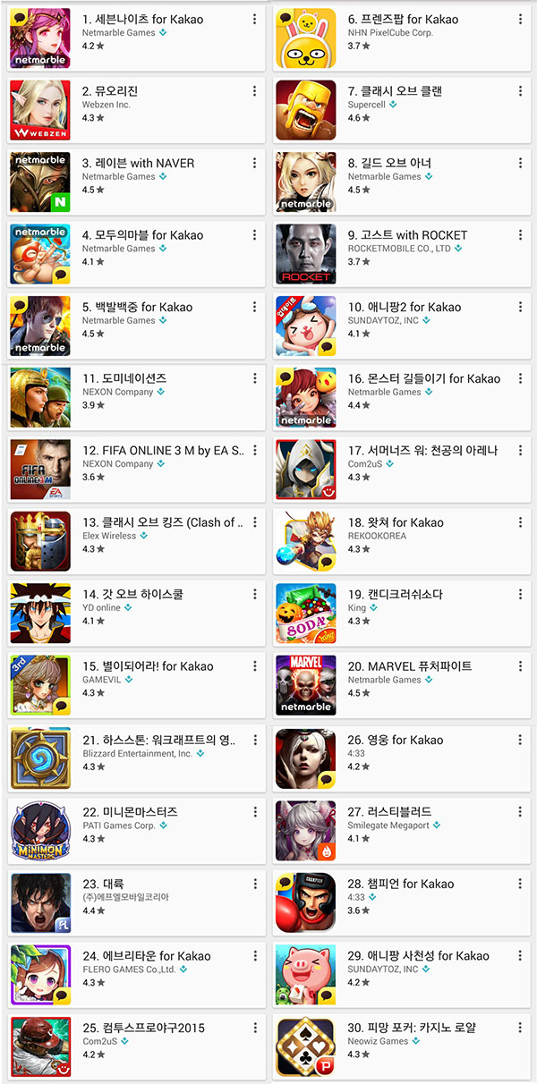 ... 전체에서는 인기(다운로드) 3위와 매출 17위를 차지했다. 슈퍼판타지워는 지난 5일 국내를 포함해 153개국에 구글플레이와 애플 앱스토어에 동시 출시했고 구글플레이 성적은 6일 오전 10시를 기준으로 아직 반영되지 않았다. ▲ 2015년 11월 6일 오전 애플 앱스