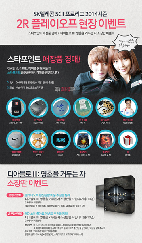 ... 각 구단 선수들의 유니폼과 마우스, 진에어 그린윙스 조성주의 트레이드 마크인 손목 아대, KT 롤스터 이영호가 장비를 챙기던 프로게이머 가방 등이 준비돼 있다. 이 경매는 프로리그 포인트 제도인 ‘스타 포인트’를 사용해서 참여할 수 있으며, 당일 경기에 참석하는 현장 관람객