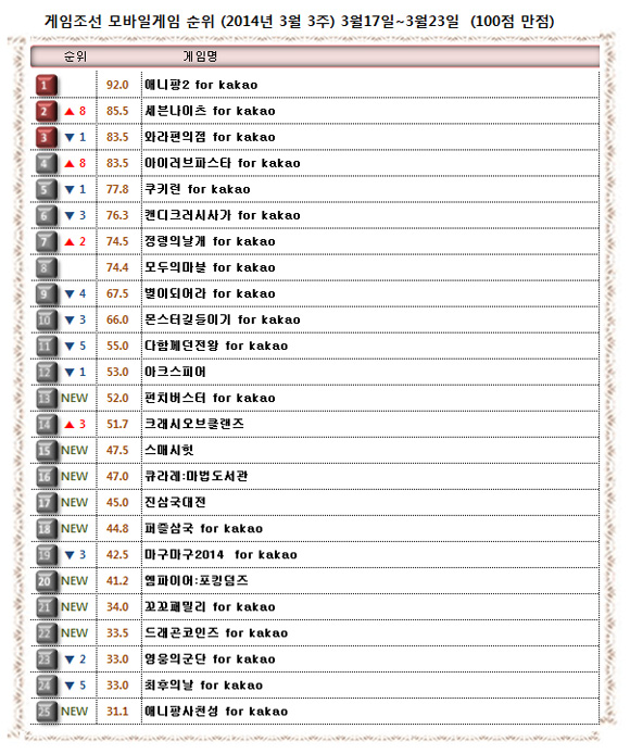 ... 3월 3주(2014년 3월 17일 ~ 2014년 3월 23일) 게임조선 모바일게임 순위입니다. 이번 주에는 ‘와라편의점’과 ‘아이러브파스타’ 등 SNG(사회적관계망게임) 장르와 ‘애니팡2’ ‘쿠키런’ ‘모두의마블’ 등 캐주얼이 강세를 보였다. RPG(역할수행게임) 중