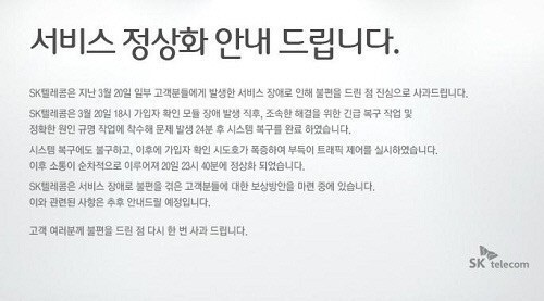... 이날 서울을 비롯한 전남, 광주 등 지방에서 오후 6시부터 약 6시간가량 SKT 통신장애가 발생했다. 이로 인해 전화를 걸면 결번이라는 안내문구가 나오거나 아무런 신호음 없이 끊기는 현상이 나타났다. 한편 SKT의 이용자 약관에는 ‘고객 책임 없이 3시간 이상 장애가