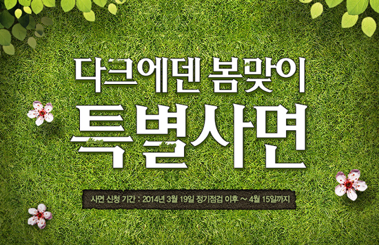 ... 사면 범위는 영구 이용 제한 계정 (2009년 1월 1일 ~ 2013년 1월 1일 이전), 기간 이용제한 계정 (2014년 2월 28일 이전 이용 제한 계정)만 해당 되며, 사면 신청 방법은 3월 19일 정기점검 이후 ~ 4월 15일 23시 59분까지 이벤트 페이지를 통해서 접