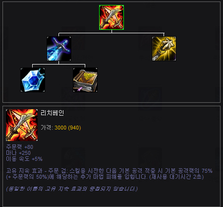 ...75 주문력)만큼 추가 마법 피해'였기 때문이다. 이같은 효과로 인해 마법 피해를 주는 대표적인 챔피언인 피즈 등에게 필수 아이템으로 각광받았다. 하지만 라이엇게임즈는 "리치베인을 활용해 강력한 마법 피해를 퍼붓는 챔피언들은 밸런스 조정이 쉽지 않아서 이번에 리치베인을 직접
