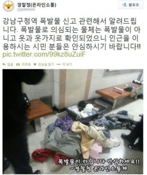 ... 많은 분들이 열차 이용에 착오 없도록 공유 부탁드린다”고 전했다. 앞서 코레일은 이날 오후 2시쯤 폭발물로 보이는 물체가 있다는 신고를 받은 뒤, 강남구청역에 열차가 지나지 않도록 운행을 중지하고 역내 고객을 대피시켰다. 한편 문제의 가방이 폭발물로 확인됐다는 잘못된