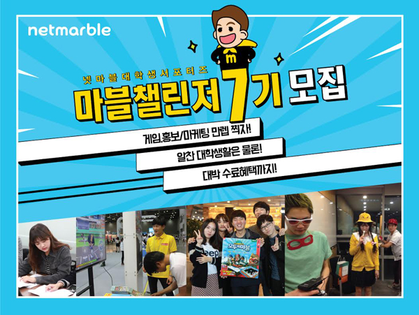 ... 서류접수는 1월 18일(월)부터 2월 2일(화)까지며, 서류심사와 면접을 거쳐 총 10명을 선발한다. 디자인 작업, 영상 촬영 및 편집을 할 수 있는 이는 우대한다. 7기는 2월부터 7월까지 6개월간 뉴미디어 콘텐츠 제작, 게임 리뷰, 각종 트렌드 분석 등의 활동을 통해 넷마블