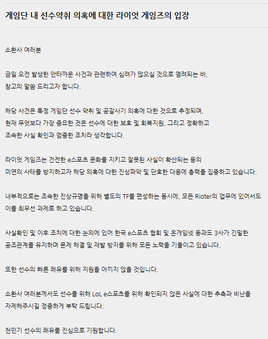 ... 라이엇게임즈는 "사실확인 및 이후 조치에 대한 논의에 있어 한국 e스포츠 협회 및 온게임넷 등과도 3사가 긴밀한 공조관계를 유지하며 문제 해결 및 재발 방지를 위해 모든 노력을 기울이고 있다"며 사태 진상 규명에 최선을 다할 것을 밝혔다. [오상직 기자 sjoh@chosu