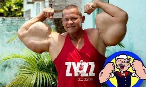 ... 이 남성의 이두 근육의 둘레는 29인치(73. 66cm)에 달하는 것으로 알려져 놀라움을 자아냈다. 그는 2년 전부터 근육 여러 부분에 미네랄 오일을 주입하고 운동을 병행해 지금의 실사판 뽀빠이 근육을 만드는데 성공한 것으로 알려졌다