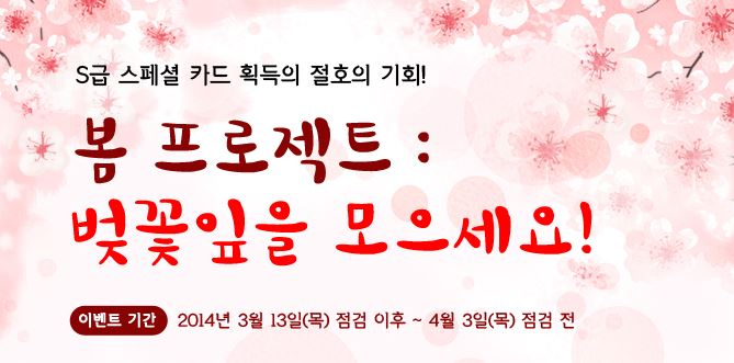 ...kr)에서 봄을 맞이해 '벚꽃 잎을 모으세요' 이벤트를 실시한다고 13일 밝혔다. 이용자는 3월 13일부터 4월 3일까지 <프리스타일2> 정규 경기 종료 후 '벚꽃 잎'을 받게 된다. 단, '벚꽃 잎'은 경기마다 무작위로 증정되며 수량이 다를 수 있다