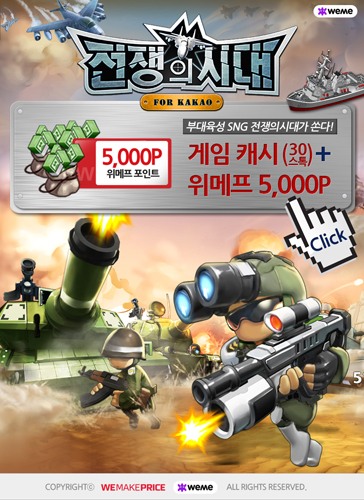 ... 이번 이벤트는 위메프 홈페이지에 마련된 '위메프 찬스딜' 코너를 통해 응모 가능하며 응모 후 발송된 쿠폰을 전쟁의 시대 쿠폰 등록란에 입력하면 30스톡을 선물로 증정한다. 이와 함께 이벤트에 참가한 이용자 대상으로 2,000명을 추첨해 위메프 5,000포인트를 추가 지급한