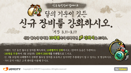 ... 월 속성이 추가됨에 따라 장비 조합 스킬 역시 기존 5종에서 16종으로 대폭 늘었다. 유저는 장비 조합을 통해 번개를 소환해 공격하는 '이매식', 바람으로 적을 강타하는 '풍운식', 적의 속도를 감소시키는 '빙각식' 등의 다채로운 스킬을 이용할 수 있다. 조이시티는 이를