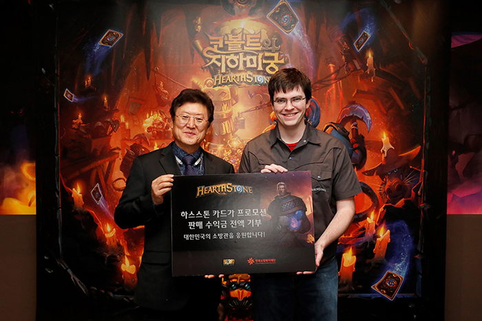 ...최근 서울 삼성동에 위치한 블리자드 엔터테인먼트 한국 지사 사무실에서 진행된 카드가 프로모션 판매 수익금 전달 기부식에는 한국소방복지재단 허수탁 이사장을 비롯해 임원진이 참석하여 한국의 하스스톤 커뮤니티와 블리자드 엔터테인먼트에 감사의 뜻을 전했으며 앞으로도 대한민국 소방관의 처우