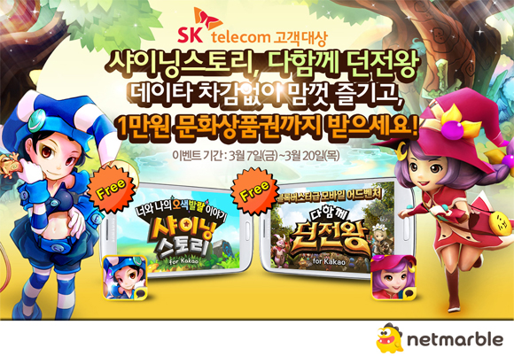 ... '샤이닝스토리'는 오는 13일까지, 다함께 던전왕은 14일부터 20일까지 순차적으로 실시한다. 넷마블은 이번 데이터프리 이벤트 체험 후 자신의 SNS에 이용후기를 작성하고 각 게임의 공식카페에 등록한 이용자 중 추첨을 통해 총 50명에게 1만 원권 문화상품권도 지급한다.