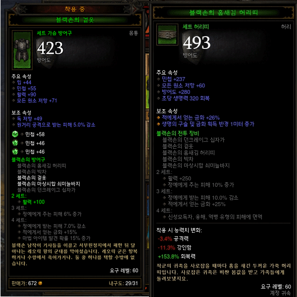 ... 많은 유저들이 착용하고 있는 블랙손 세트를 확인한 결과 2세트시 활력 +100에 불과하던 세트 효과가 새로 적용된 아이템의 경우 활력 +250에 정예에게 주는 피해 10%로 늘었다. 이는 구 아이템에서 3세트를 착용할 경우 정예에게 주는 피해 6% 증가와 비교했을 때와
