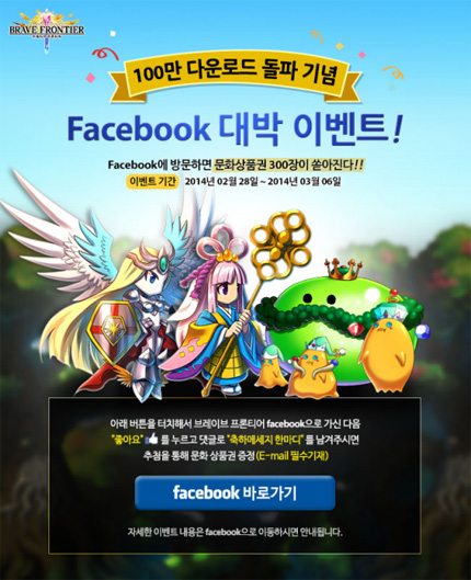 ... 또 지속적인 업데이트와 꾸준한 이벤트로 이용자들로부터 긍정적인 평가를 이어오고 있다. 한편 gumi Korea는 ‘브레이브프론티어’ 100만 다운로드 돌파를 기념해 이벤트를 진행한다. ‘브레이브프론티어’ 공식 페이스북(http://www