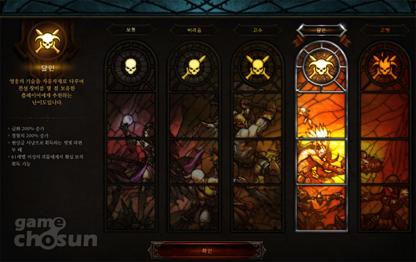 ... 이전 버전에서 퀘스트 진행시 불지옥이 최고였다면 여기에 더해 게임 난이도를 더한 것이다. 디아블로3의 난이도는 총 다섯 가지로 구분돼 있으며 보통, 어려움, 고수, 달인, 고행 등으로 나뉜다. 보통의 경우 추가 보상이 없으며, 어려움은 금화와 경험치가 75% 향상된다