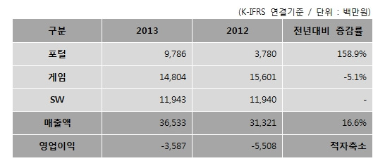 ... 아울러 ‘국제회계기준(K-IFRS)’에 근거한 2013년 연결 기준 실적 또한 6억원의 영업 이익을 달성, 2012년에 이어 연속 흑자 기조를 유지했다. 이와 같은 결과는 온라인 분야에 집중되어 있는 구조를 탈피, 다양한 플랫폼 확장과 경영 재무구조 안정화, 여기에 비용 감축