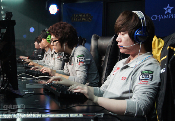 ... 이승민은 4분도 되기 전에 상대방 시비르의 방어막을 소모시켰다. 하지만 적절한 타이밍에 갱킹을 온 '리즐' 김재현(리신)에 의해 선취점을 내주고 말았다. 분위기가 넘어가려던 찰나 '레인오버' 김의진(올라프)이 맵을 휘젓고 다녔다