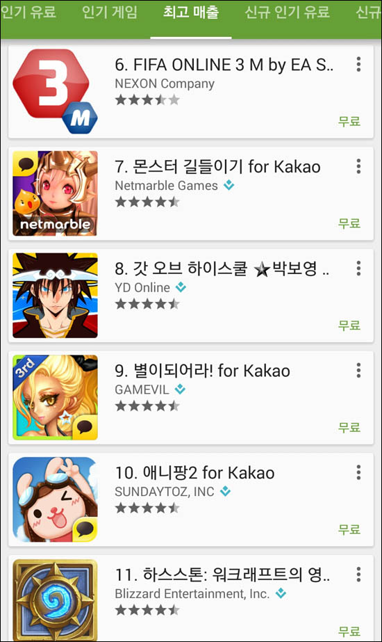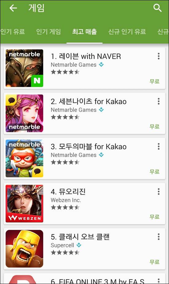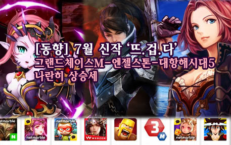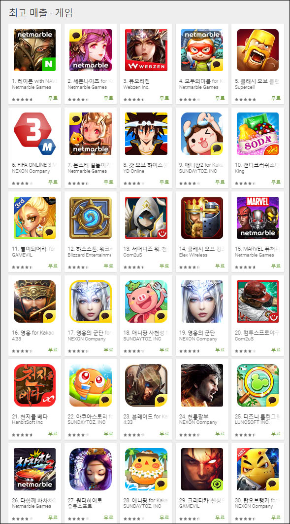 ... ▲ 7월 27일 넷마블은 구글플레이 매출 1-2-3위를 석권했다. 레이븐은 '뮤오리진'에 잠시 1위를 내준 것을 제외하고는 꾸준히 1위를 유지 중이며 여름 업데이트 특수를 누린 '세븐나이츠'는 3일 현재까지 2위를 유지 중이다. 뮤오리진과 모두의마블은 자리를 바꿔