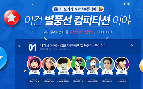 ... 이는 별풍선 쿠폰이 넥슨플레이 포인트 상점에 입고한 것을 기념해 진행되는 것으로 넥슨플레이는 아프리카TV와 제휴로 별풍선을 제공하는 첫 모바일 플랫폼이 됐다. 이벤트 기간 중 넥슨플레이에 가입 시 추천인란에 아프리카TV 인기 BJ 7인(쪼꼬북, 도복순, 지배자로리, 감스트