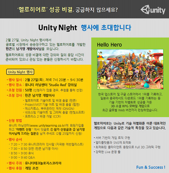 ... 남기영 이사는 CCR과 한빛소프트, 웹젠을 거쳐 유충길 대표와 함께 핀콘을 창립한 개발자로 ‘헬로히어로’에서는 유니티 엔진을 활용한 기술 아트와 배경을 총괄 담당했다. 참가 희망자는 유니티 러닝센터(http://www. unitylearning