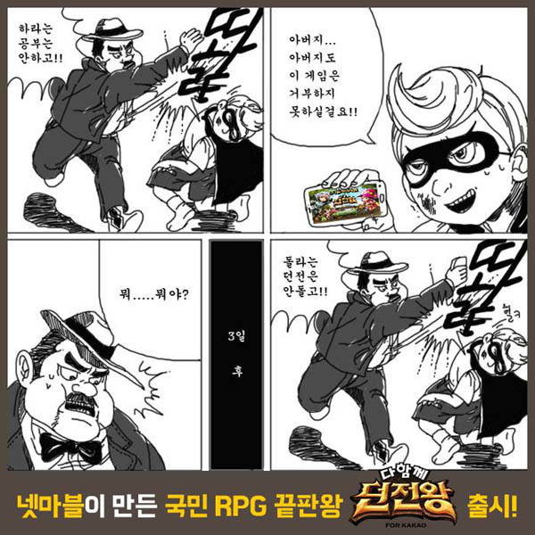 ... 당황한 데니스. 그렇게 도착한 슬기네 집에서 슬기는 넷마블의 신작RPG '다함께던전왕'을 함께 하자고 한다. 이는 넷마블 공식 페이스북이 18일 공개한 '다함께던전왕'의 홍보 만화 내용이다