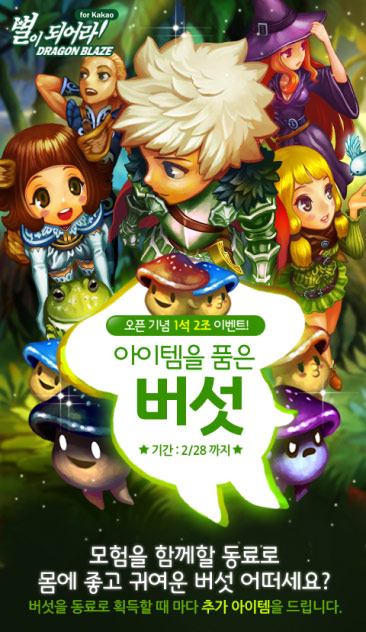 ... 더불어 다른 친구들과 함께 언제 어디서나 플레이 할 수 있는 친구 교류 시스템, 우정 포인트 교류, 채팅 시스템 등 풍성한 소셜 콘텐츠도 기대 요소로 꼽힌다. 게임빌은 출시를 기념해 오는 28일까지 ‘아이템을 품은 버섯 이벤트’를 진행한다. 색상별로 3종류의 버섯 몬스터를