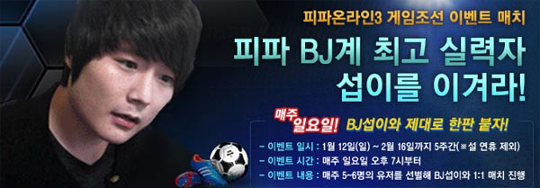 ...co. kr)은 피파 BJ계 최고 실력자인 BJ섭이와 1대1 맞대결을 펼치는 'BJ섭이와 제대로 한판 붙자'대회를 23일까지 연장한다고 밝혔다. 이 대회는 지난 1월 12일부터 매주 일요일 오후 7시부터 5주간 진행 예정이었으나 1주 연장돼 총 6주간 펼쳐진다