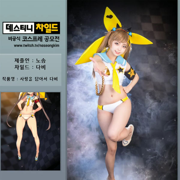 ... 공모전에는 '포이 큐브' '헤라클레스' '바스테트' '다비' '시링크스' '베스타' '레우케' '아폴론' '에르메스' '숲의 주시자' 등 게임 내에서 인지도가 높은 캐릭터들로 화한 참가자들이 인기를 끌었다. 김나성 스트리머는 "데스티니차일드라는 게임이 그저 재밌고 좋아서