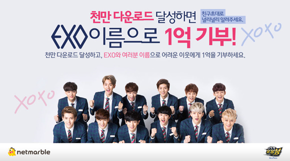 ... 오는 3월 31일까지 '다함께 붕붕붕' 천만 다운로드를 달성하면 엑소와 게임 이용자 이름으로 사회복지단체에 1억 원을 기부하게 된다. 넷마블은 기부 행사와 더불어 엑소가 부르는 '다함께 붕붕붕송' 영상을 공개한다. TV광고에 등장하는 영상 속 쿠폰번호를 오는 8일부터 22일