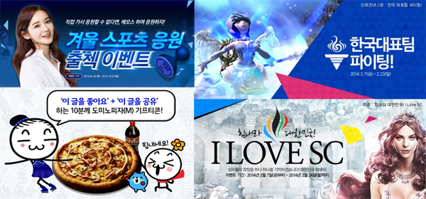 ... 특히 김연아, 이상화 등 올림픽 대표팀에 쏠린 국민적 관심을 자사 게임에 돌리기 위한 업체간의 신경전이 벌써부터 치열해지고 있다. 우선 넥슨은 오는 19일까지 축구게임 '피파온라인3'에 승리기원 이벤트를 실시한다. 이용자는 해당 기간 동안 게임에 접속만 해도 매일 전설을