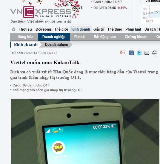 ... VN익스프레스 보도에 따르면 비에텔은 "카카오톡 인수를 위한 대화를 진행 중"이라며 "카카오 전체 혹은 70%의 지분을 인수하는 등 두 가지 방안으로 협의 중"이라고 밝혔다. 하지만 이 같은 보도에 대해 카카오 측은 사실이 아니라고 밝혔다. 카카오 한 관계자는 "사실무