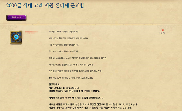... 미뉴쿤이라는 이름으로 돌아온 답변은 "디아블로3 게임 문제 현상에 문의 주셨다"로 시작해 1. 07 패치로 수정된 업적에 대해 상세하게 설명했다. 유저 문의와 전혀 다른 답변이 되돌아온 셈이다
