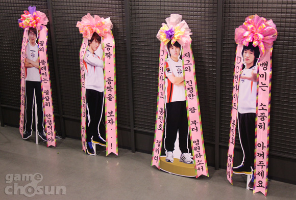 ... 선수얼굴과 함께 '광의 플레이는 굉장히 안정적이야' '등짝을 보자!' '뱅미는 소중히 아껴주세요' '포퐁은 2번 모라친다(몰아친다)' '광렐루야! 승리의 찬가' 등의 문구가 적혀있다. ▲ 넥슨 아레나e스타디움에 설치된 DC홍진호갤러리 응원 문구들 [이관우 기